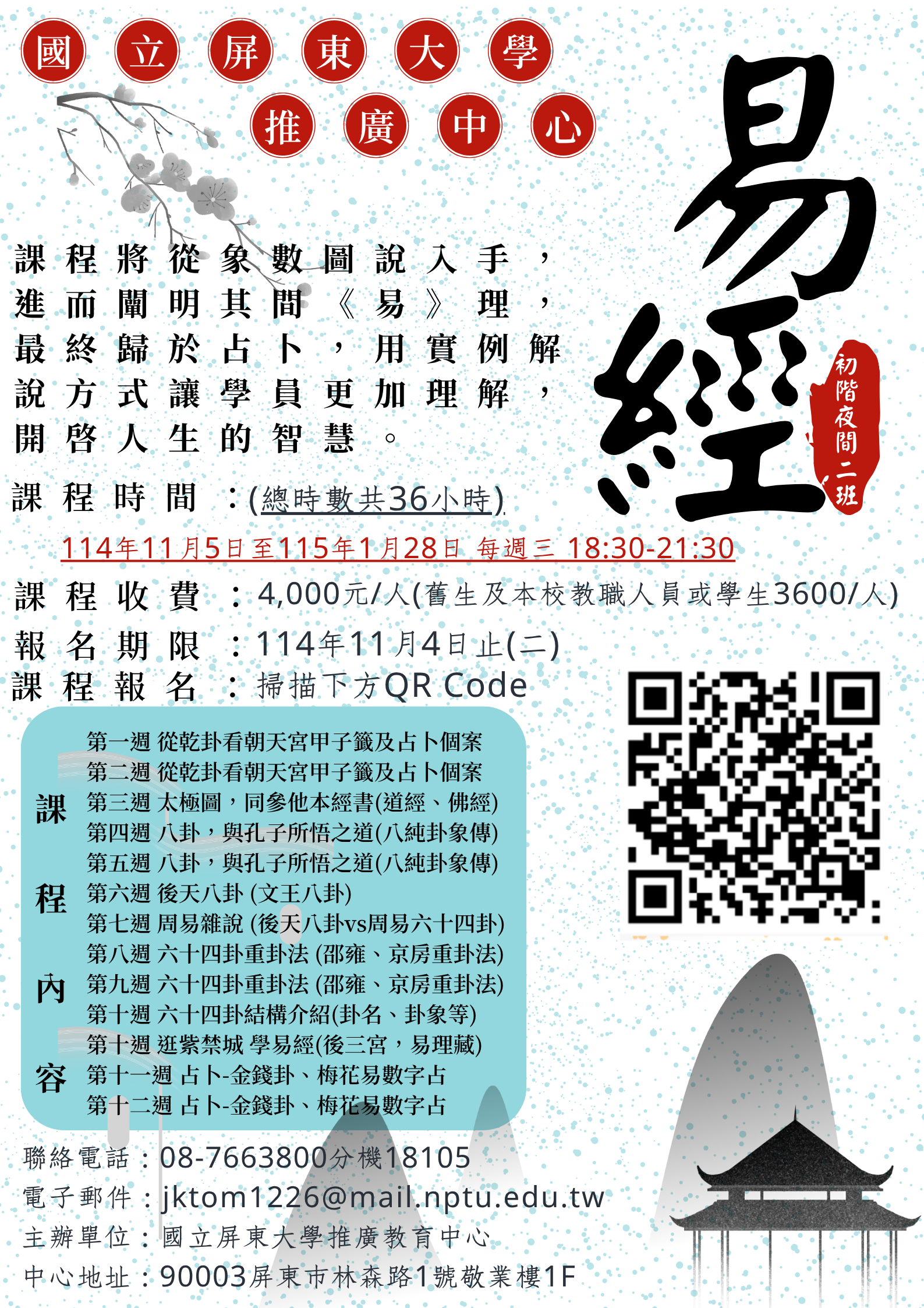 - 本校推廣教育中心辦公室地址:90003屏東市林森路1號敬業樓1F