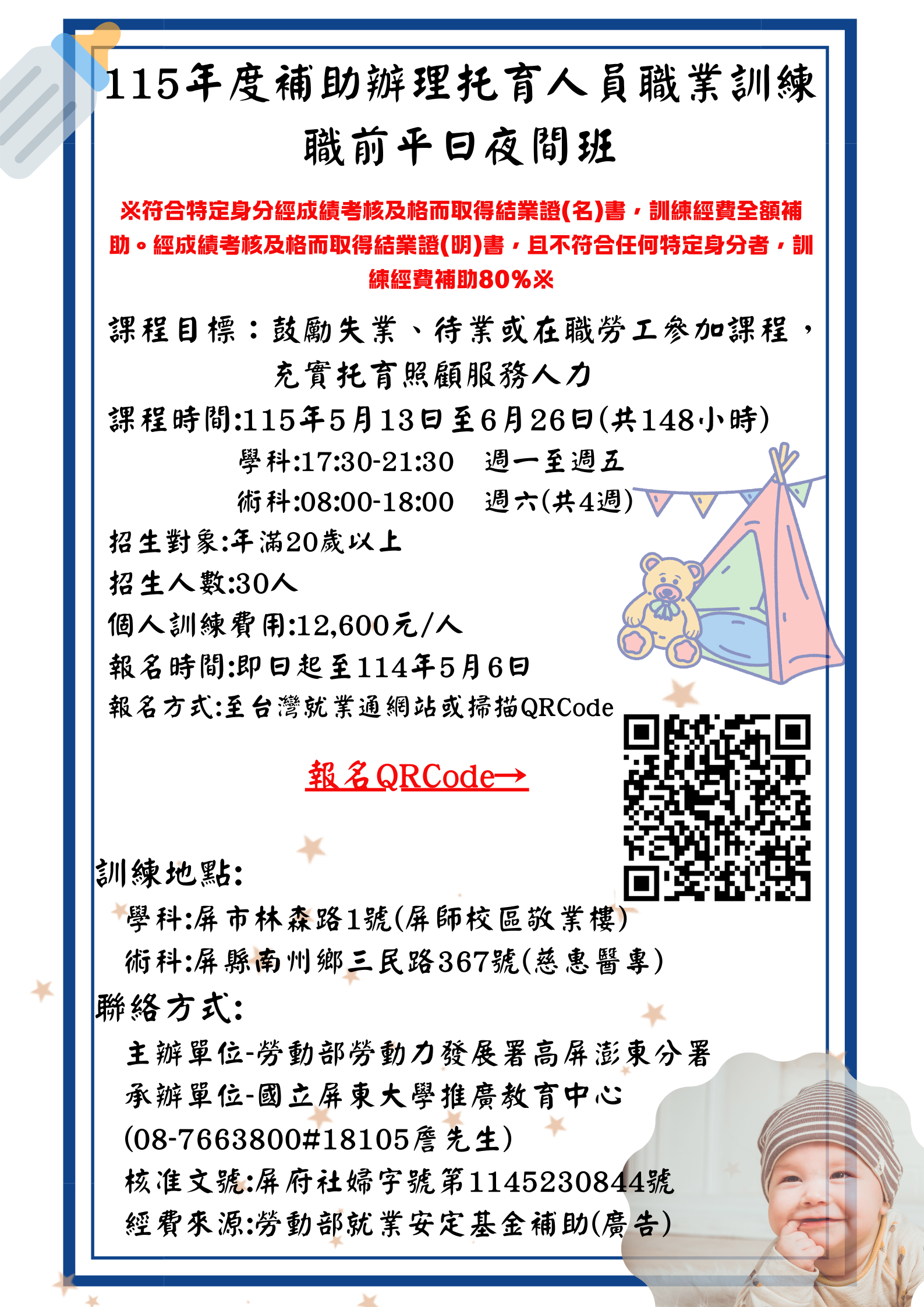 勞動部勞動力發展署高屏澎東分署補助國立屏東大學辦理「114年度補助辦理托育人員職業訓練」-BS14托育人員職前平日夜間班開始招生